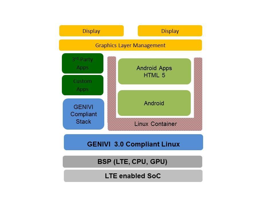 汽車制造商還在想辦法整合車輛功能,其中一個方法是在一個硬件平臺上運行多種操作系統和服務。下面的結構顯示,標準 GENIVI Linux 平臺頂部裝載了 Linux 容器 (LXC),容器內部則能安裝安卓等客戶操作系統。這樣系統用戶能夠安全地下載使用安卓應用,核心車載功能也不會受到影響(圖2)。