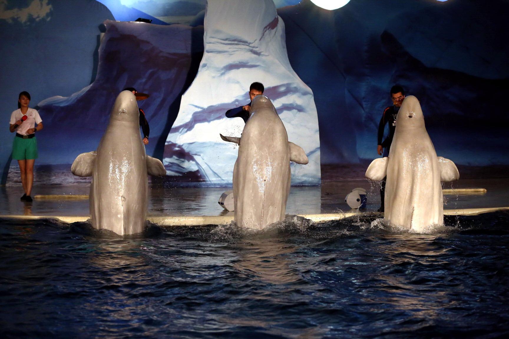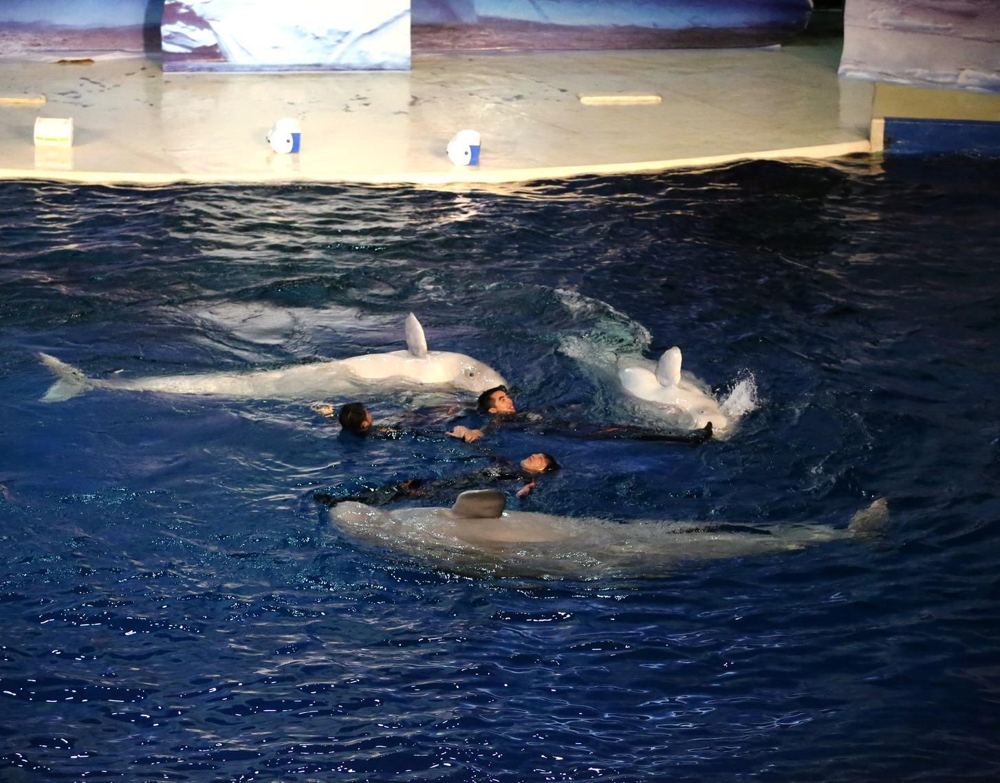 憨態可掬的白鯨一直深受人們的喜愛。生活在上海長風海洋世界極地白鯨館的這三頭白鯨更是小朋友們心目中的超級巨星。充滿靈性的白鯨三姐妹 -- 君君,小灰和小白與馴養員親密互動,在水中舞動著婀娜靈巧的身段,帶來一支唯美浪漫的水中華爾茲。與以往的表演有所不同,這是三條白鯨在上海奉上的首次同臺演出,并在三名馴養員的配合下展現了人鯨相伴共舞的和諧之美。她們華麗浪漫的舞姿完美呈現了人與動物之間的親密與和諧,人鯨之間的默契配合和深厚友誼也觸動了在場觀眾的感情。