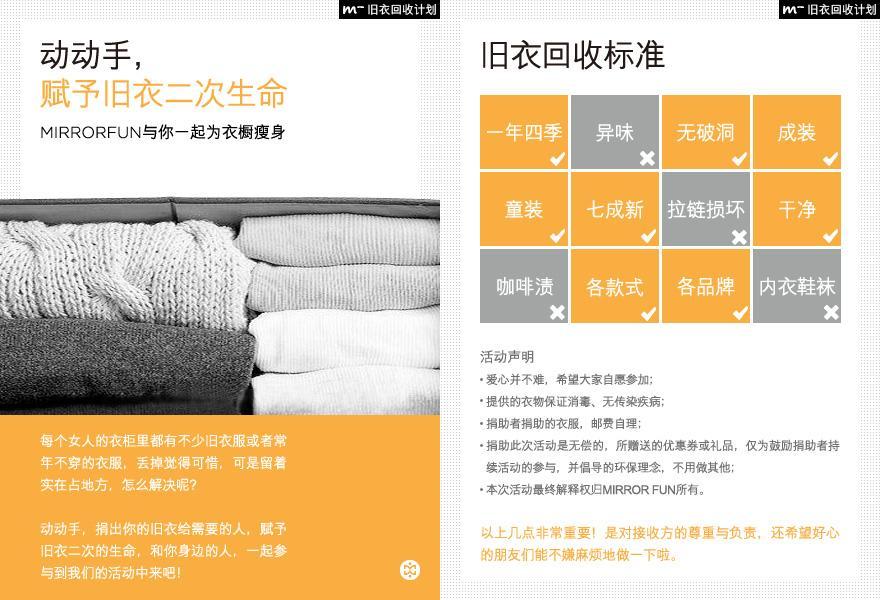 2、有始有終獎(jiǎng):自己收集舊衣參與活動(dòng)+@三位好友+ mirrorfun官方微博+拍捐助舊衣的照片(鼓勵(lì)大家全程直播自己捐衣過程),將贈(zèng)送mirrorfun獨(dú)家研發(fā)的專屬禮品一份。