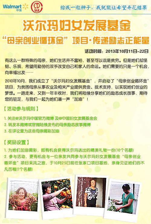深圳2013年10月14日電 /美通社/ -- 近日,沃爾瑪中國(guó)在官方微博(@沃爾瑪中國(guó)官方微博,http://weibo.com/wmcsr)上線“為創(chuàng)業(yè)母親喝彩,傳播勵(lì)志正能量”慈善主題活動(dòng),講述在沃爾瑪“母親創(chuàng)業(yè)循環(huán)金”項(xiàng)目幫助下,貧困母親的勵(lì)志創(chuàng)業(yè)故事;并號(hào)召網(wǎng)友參與互動(dòng),為這些通過(guò)辛勞改變自己和家人命運(yùn)的母親們喝彩。網(wǎng)友參與微博活動(dòng),即有機(jī)會(huì)贏取精美禮物,還有可能被選中參與沃爾瑪“母親創(chuàng)業(yè)循環(huán)金”項(xiàng)目采風(fēng)之旅,前往張家口項(xiàng)目基地,見證創(chuàng)業(yè)母親的成長(zhǎng)歷程。