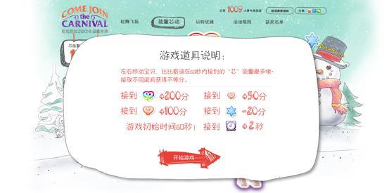 游戲為分制評判,每接到彩虹羽絨“芯”,加分200分,大小不同的羽絨“芯”分別加100分和50分,如果你的反應(yīng)稍有遲緩碰到冷冰冰的小雪花,就會因打寒戰(zhàn)而減去20分,在有限的時間里接到越多羽絨“芯”分數(shù)就會越高,而及時出現(xiàn)的小鬧鐘會延長5秒鐘游戲時間。每天分數(shù)較高的前十位玩家,都將獲得精美獎品一份,獲獎結(jié)果將以第一次排名為準,每位玩家將只有一次獲獎機會,之后繼續(xù)參與游戲的玩家,分數(shù)只參與排名,不再加入獲獎名單。