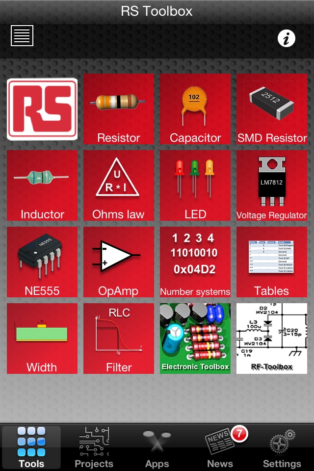 RS Toolbox 提供一系列廣泛的功能,均以圖標形式在主屏幕上分組呈現,包括多種工程計算器、轉換器和查詢表。例如RLC濾波計算器,555定時配置器,用于各種穩壓器和運算放大器的計算器,以及諸如編號系統轉換器和歐姆定律計算器等基本工具,還有包括電池類型與尺寸、電纜顏色編碼、封裝尺寸和螺線管規格等內容的查詢表。